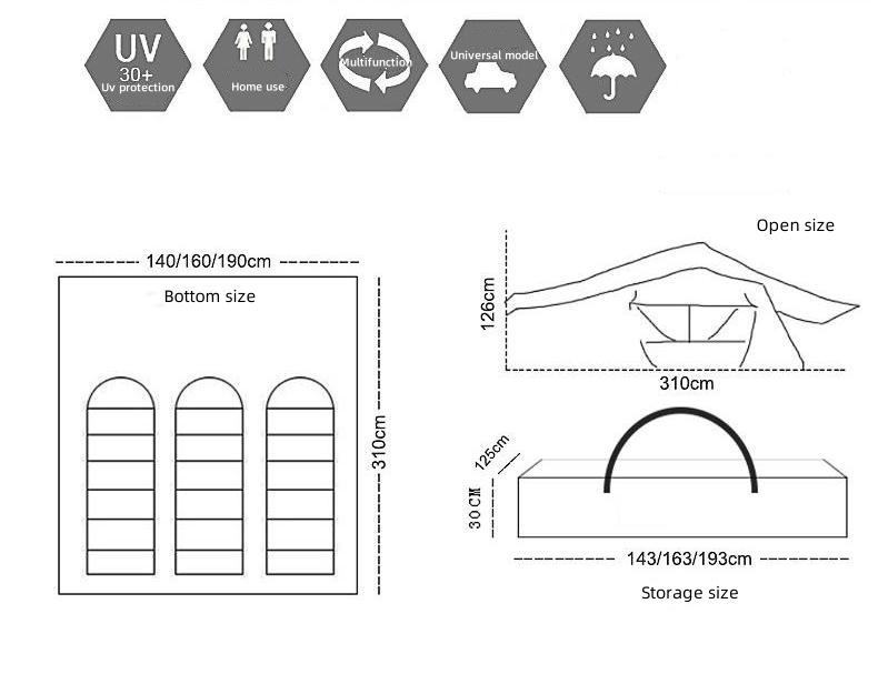 | Размер в открытом виде (Д×Ш×В) | S: 310×140×126 см M: 310×160×126 см L: 310×190×126 см |